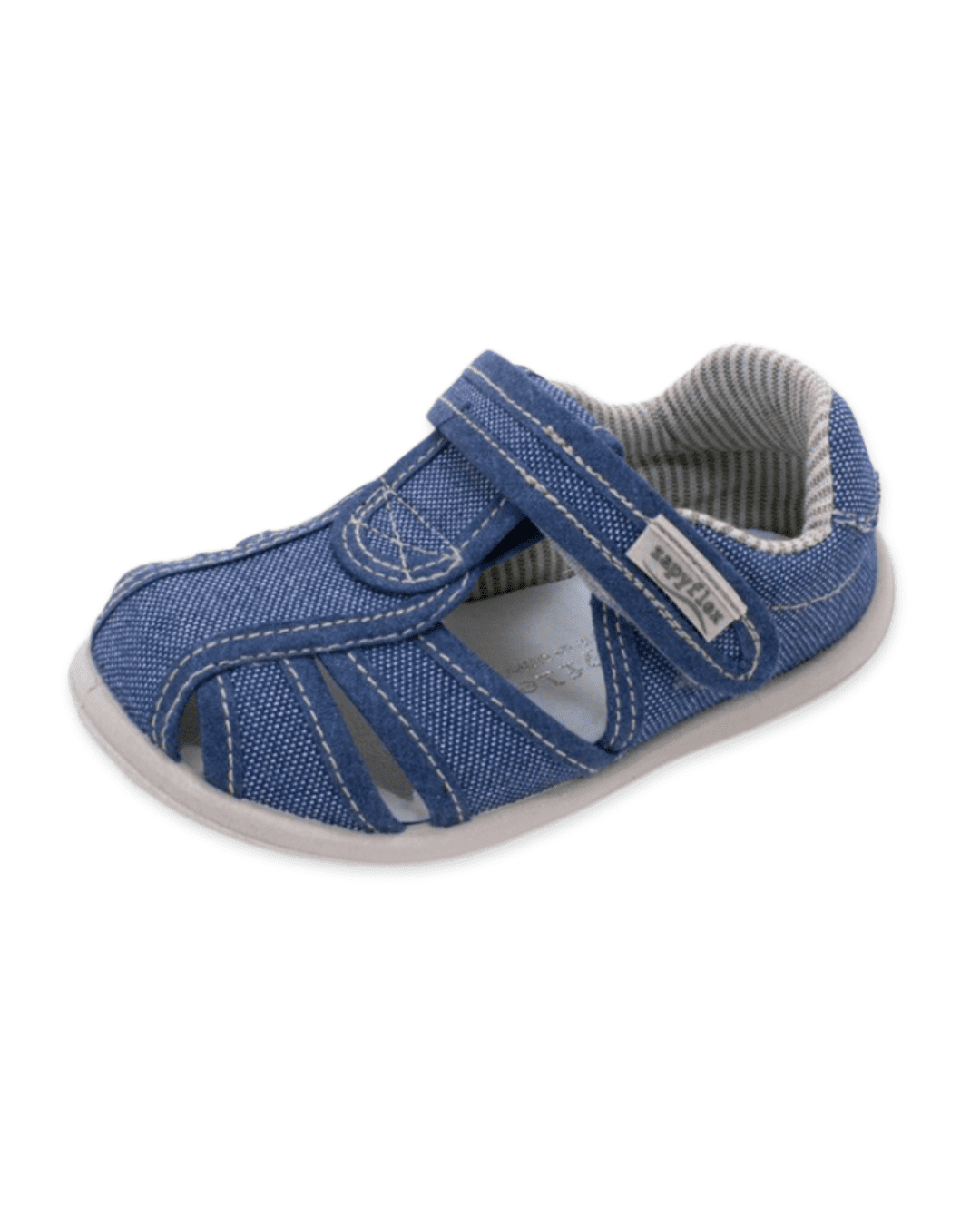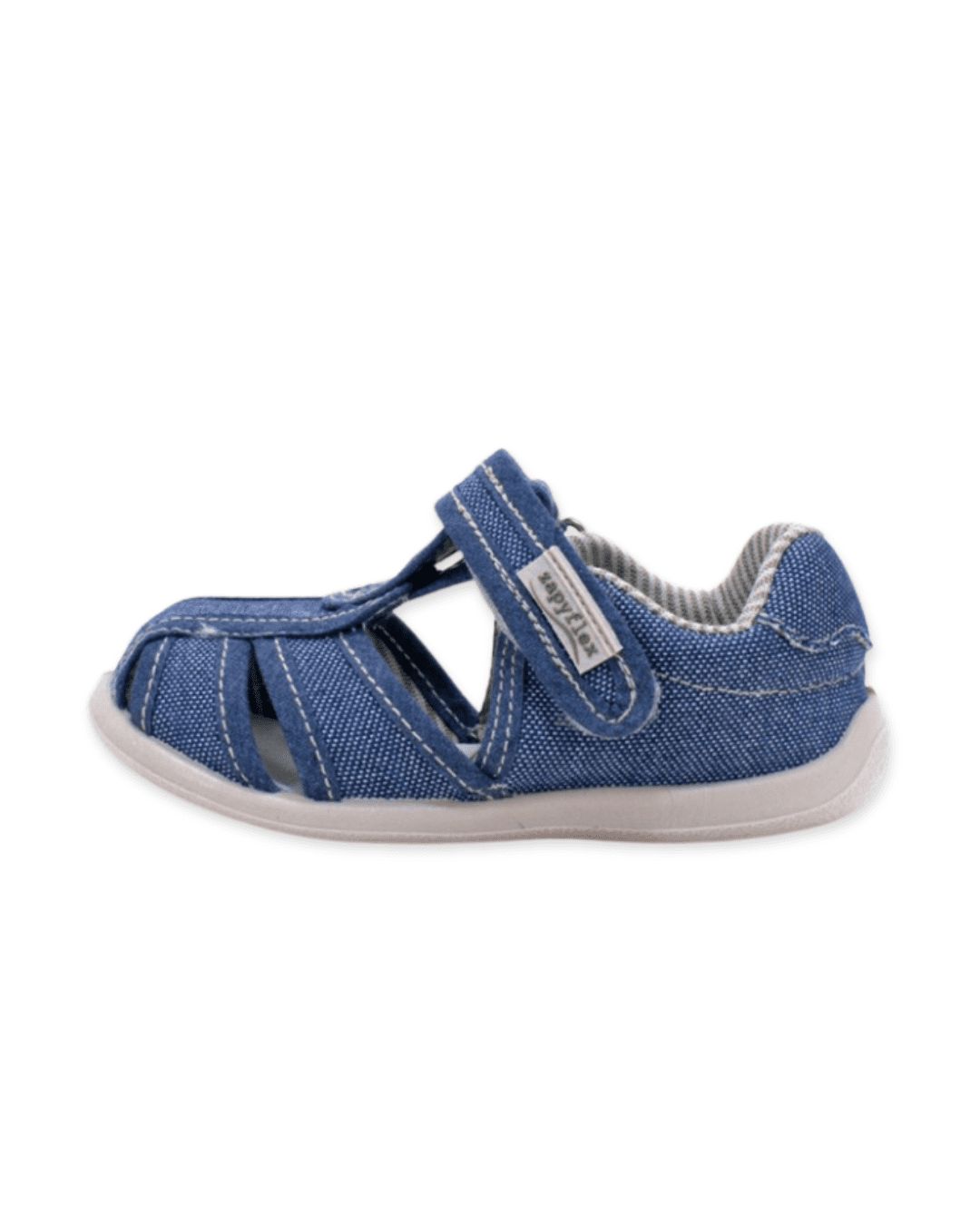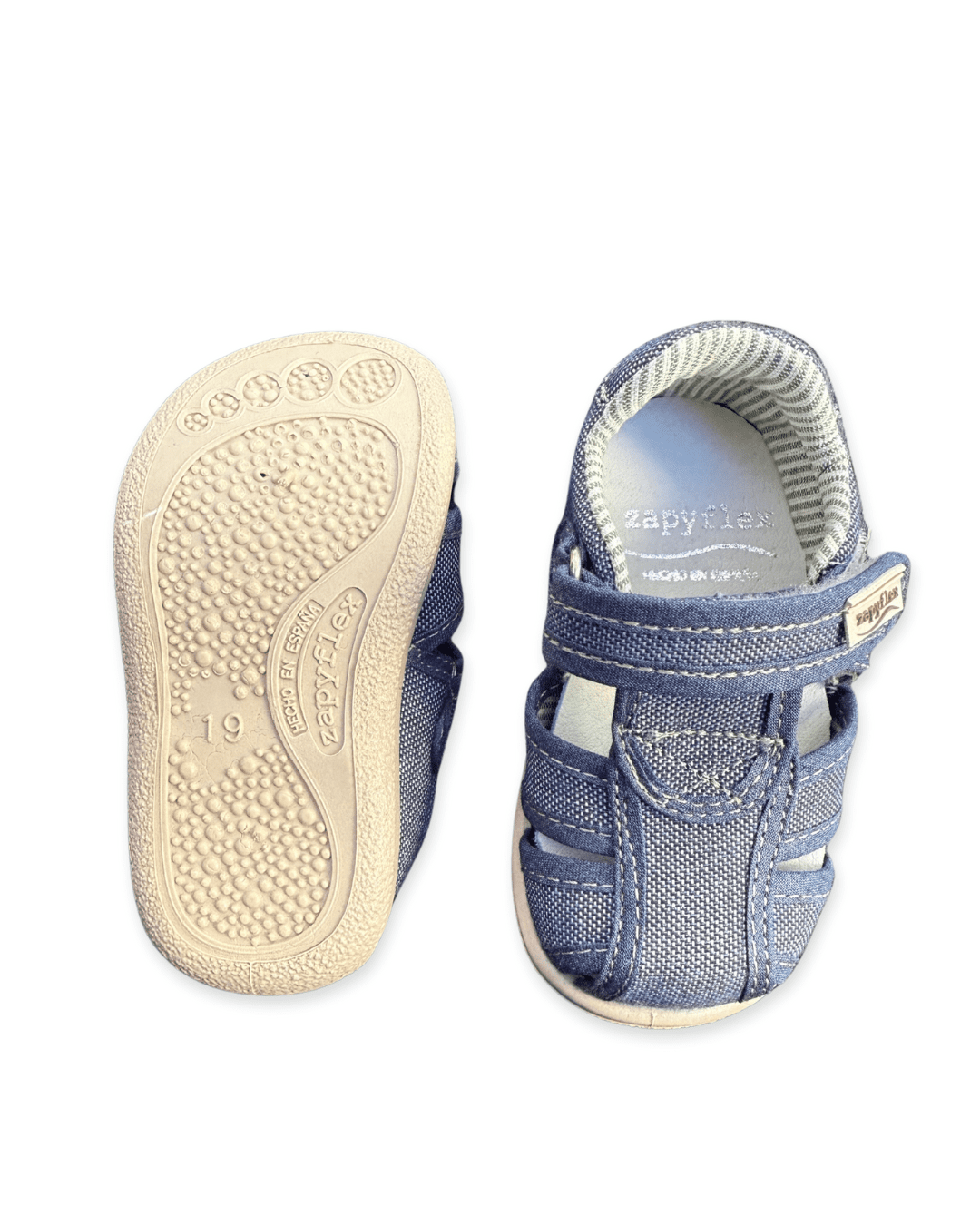 👣 Sandalia Cangrejera respetuosa de lona vaquera infantil, perfecta para los primeros pasos.